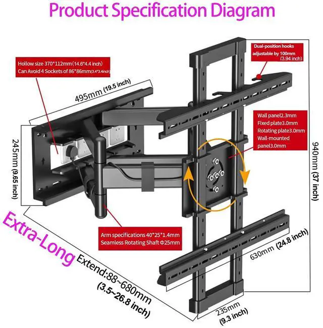 Portrait: The full motion tv wall mount is fully adjustable to your comfortable viewing angle for a high quality viewing experience, Rotation +/-90, swivels +/-60 without tools, tilts -5/+8 to reduce glare, Leveling +/-3, long articulating dual arms extends up to 26.8 inches (680 mm) and retracts to 3.5 inches (88 mm) can both adjust the viewing distance and save space ^^