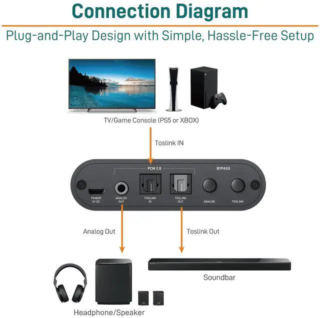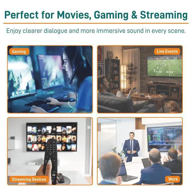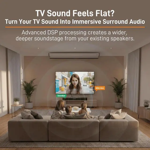Immersive 3D Spatial AudioTransform your living room into a cinematic theater with an expanded three dimensional soundstage. Our advanced DSP enhancement box creates an enveloping atmosphere to make every movie feel like a professional theater experience. ^^ Superior Vocal ClarityStop struggling to hear dialogue over loud background music and sound effects. This optimizer intelligently clarifies speech and balances volume levels in real time so you never miss a single word or whisper. ^^ Lossless High Resolution AudioZero technical skills required. Simply connect, set your TV PCM to virtual 3D surround sound and enjoy.
