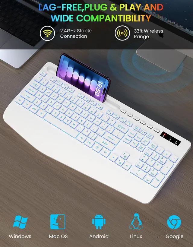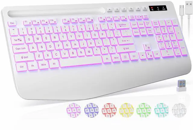 7 SWITCHABLE COLORS BACKLIGHT The ergonomic wireless keyboard comes with 7 switchable backlights and 3 brightness levels to provide you with a different visual typing atmosphere. Choose your favorite keyboard setting and take your desk setup to the next level. The keys will be clearer under the backlight, too. Let you work effortlessly in the dark typing. ^^ ERGONOMIC PALM RESTOur light up keyboard with wrist rest and foldable stand design improves overall comfort and reduces pressure on hands and wrists. Helps your wrist to be in a comfortable position and better body posture.