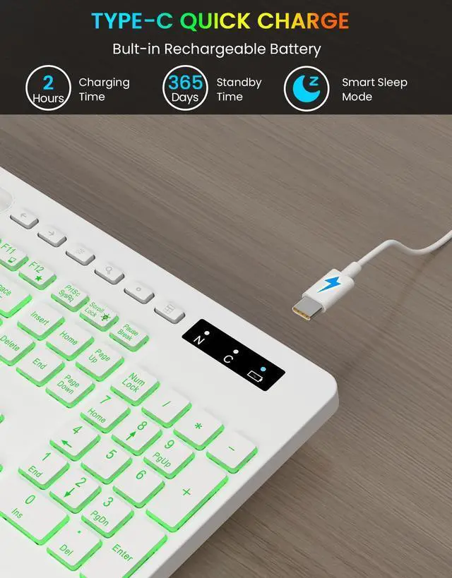 Perfect for those Office-men needing long time working with the keyboard. ^^ RECHARGEABLE AND LONG LASTINGThe rechargeable wireless keyboard is equipped with Type-C charging cable, This ergo keyboard has automatic sleep power saving mode and a separate ON/OFF switch. You can also adjust the light brightness at any time or turn off the light to save power. ^^ QUIET AND COMFORTABLE TYPINGThe responsive low profile keys offer fluid, quiet, laptop-like efficient typing. Same time, waterproof & dustproof, Spill Resistant. Our backlit wireless keyboard remove over 95% of disruptive sounds.