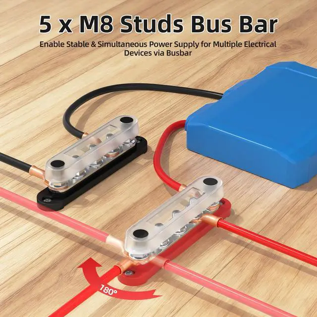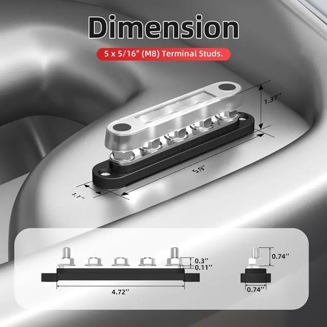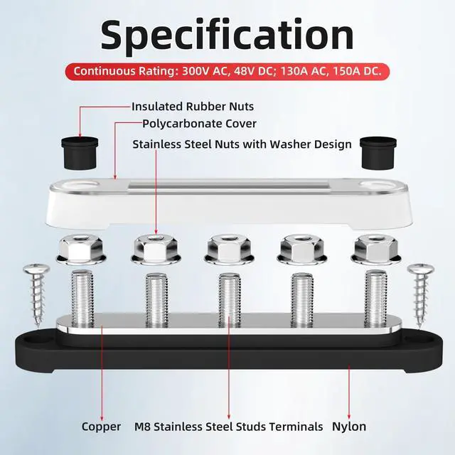 Product Name- 12v power distribution block, these battery distribution blocks will come in pairs, includes one positive distribution block (red one) and one ground distribution block (black one). ^^ Terminals & Rating- Each 12V distribution block features 5 x M8 (5/16") terminal studs. It is rated for a maximum voltage of 300V AC / 48V DC and a continuous current of 130A AC / 150A DC. ^^ Round Corner Base - The 12V bus bar terminal block incorporates a uniquely designed rounded-corner base. This distinctive feature sets it apart from conventional blocks and contributes to its superior overall aesthetics.