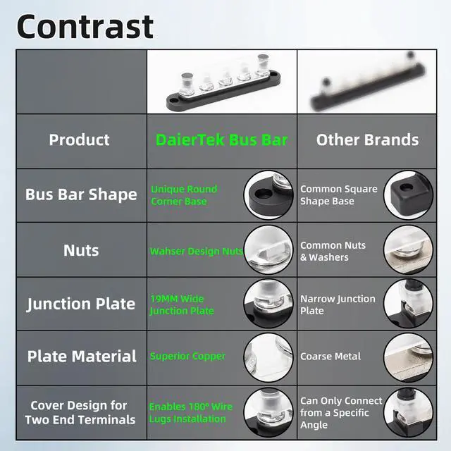 ^^ More Exposed Area Design Cover - The cover of this pair of busbars will allow 180 wire lug installation and can meet variety kinds of installat methods of end terminals. ^^ Application - This power bus bar uses copper plates and stainless steel terminals as conductors, which enables the junction block 12v to work in extreme environment, suitable for automotive, car, marine, boat, etc.