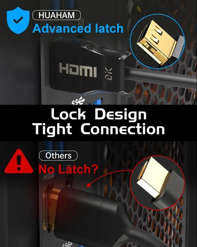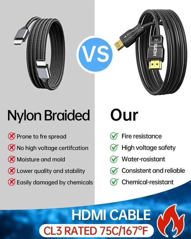 Upgrade Revolutionary HDMI 2.1T he new 10K 8K HDMI 2.1 cable enters the 10K 8K world. The 24K gold-plated connector zinc alloy shell increases the service life of the cable, and the lock design is not easy to fall off. The advanced HDMI 2.1 chip ensures 48Gbps data transmission and supports resolutions up to 8K (7680 x 4320) without signal loss. No stuttering or frame drops when playing games/watching TV/videos, faster and smoother than 4K HDMI cables. ^^ CL3 in Wall RatedCL3 Rated, PVC sheathing is specially treated for in-wall installation. The aluminum alloy shell has better insulation and is more durable.