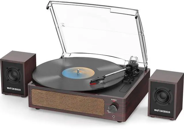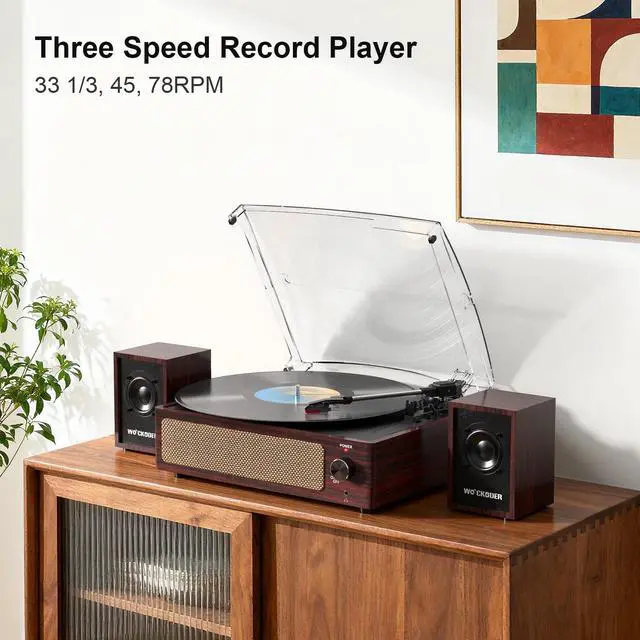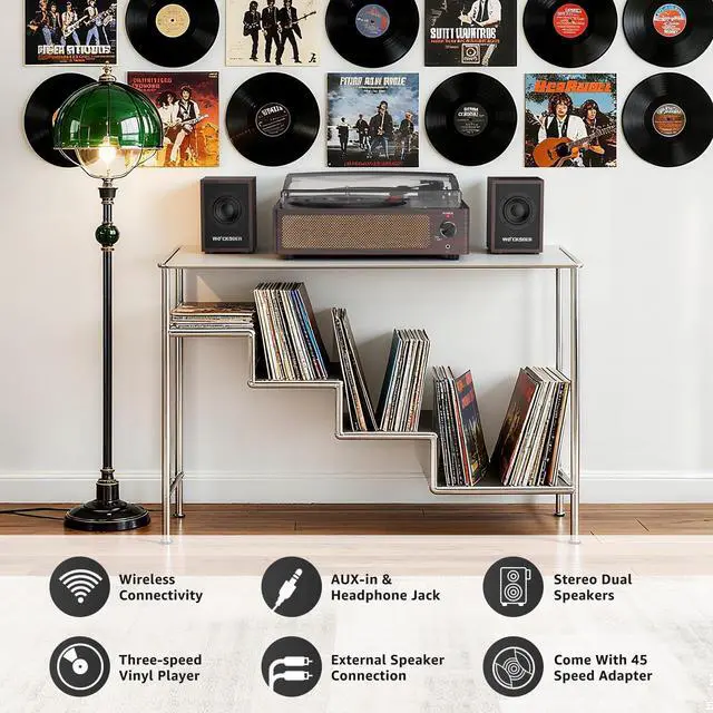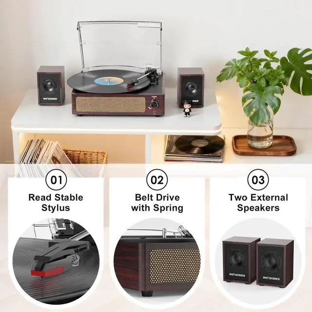 [Three-Speed Belt-Drive Turntable] - Plays 33 1/3, 45, and 78 RPM records; Use the lifting lever to lower the needle and playback; Auto stop after opening, it will automatically stop playing once the playback ends. The turntable base is equipped with a spring and belt-driven design to provide shock absorption and improve sound quality