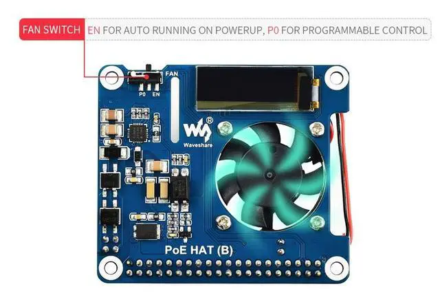 Status In Real-TimeCooling Fan: Allows Auto Running On Powerup OR Programmable Control, Configured By Switch; Automatically Turn On/Off Depending On The Pi Processor TemperatureOnboard PCF8574 Chip: PCF8574 IO Expander For I2C Bus, Providing 8 IO Pins, Of Which P0 For Fan Control; And Extra Spare Pins On Solder Pads (P1-P7, INT)FeaturesStandard Pi 40PIN GPIO header, fits Raspberry Pi 3B+/4BPoE (Power Over Ethernet) capability 802.3 af-compliantFully isolated switched-mode power supply (SMPS) 0.91" OLED, for monitoring processor temperature, IP address, and fan status in real-timeOnboard cooling fan, allows auto running on powerup OR programmable control, configured by switchIntegrates PCF8574 IO expander for I2C bus, providing pin P0 for directly fan control, and more spare IO pinsPackage Content1. PoE HAT (B) x12. Standoffs pack x1