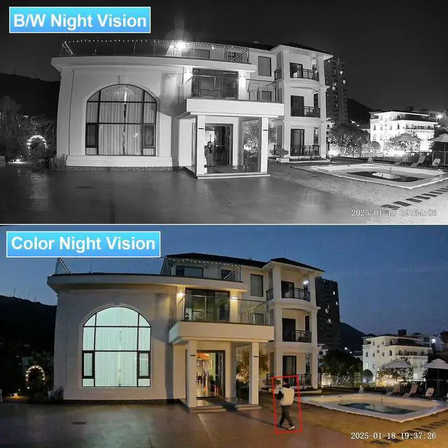 INTELLIGENT COLOR NIGHT VISION: This camera offers three night vision modes: black & white, full-color, and smart dual-light. The default factory setting is the smart dual-light mode. In this mode, the camera automatically switches from black-and-white night vision to full-color mode when detecting a person or vehicle, capturing more details. Once the person or vehicle leaves, the night vision reverts from full-color to black-and-white mode. ^^ PLUG and PLAY with