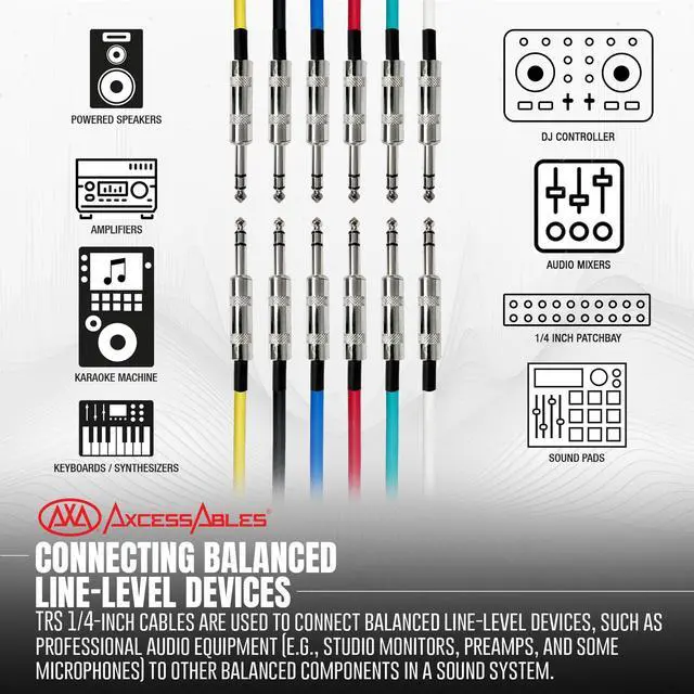 ^^ AxcessAbles color-coded cables are perfect for efficient identification and organization purposes. The use of distinct colors allows for quick and easy recognition, making it simple to differentiate between various cables and streamline your setup. ^^ The TRS 1/4-inch ( 6.35 mm) stereo balanced male-to-male connection is a versatile audio cable for instruments, studios, and various applications. It enables balanced audio connections, links line-level devices, connects effects loops, patches audio systems, and ensures high-quality balanced audio transmission. ^^ AxcessAbles provides a 1-year warranty, ensuring customer satisfaction. Our US-based support team is here to assist you with any technical issues or inquiries you may have.