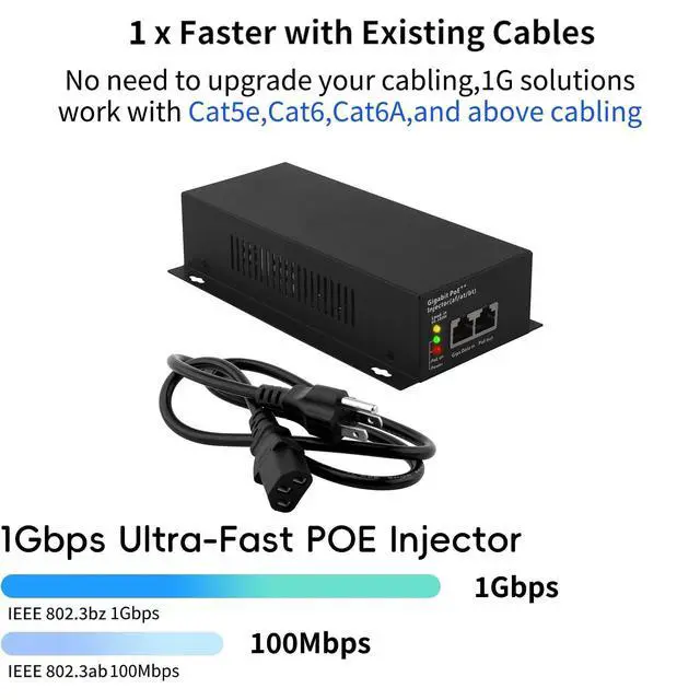 High Speed & Stable Data TransmissionOur PoE+ injector adapter has 1 input port and 1 POE++ Gigabit Ethernet output port, can reach a maximum speed of 1000Mbps, ensuring fast and stable data transmission for powerline network adapters. ^^ Compatible with Various DevicesThe Gigabit 48V PoE injector provides maximum 90W (52-57V DC) power through a single port and is backward compatible with 802.3AF POE ( 15.4W ) and 802.3AT PoE+ injector gigabit (30W). ^^ Convenient InstallationBuilt-in AC/DC converter, no external power adapter is required, plug-and-play PoE+ injector adapter design, and LED power indicator lights to grasp the operating status of the device in real time, making installation more convenient.