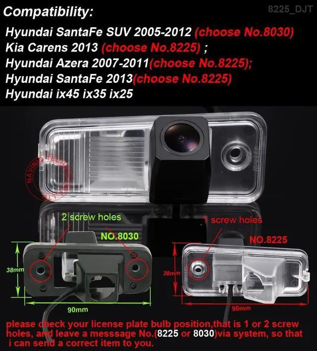 Fit for Hyundai SantaFe 2013 SantaFe SUV 2005-2012 Azera 2007-2011 IX25 IX35 IX45 2001-2012 ^^ 170 Super Wide Angle Lens, Waterproof, Dust-proof, Anti-fog, Shock-proof ^^ Designed according to the license light hole install ^^ High Clear, Night Vision, Plastic material ^^ Better Help Your Parking, In the Screen, You Could See the Back Cars, Obstacles or Children.