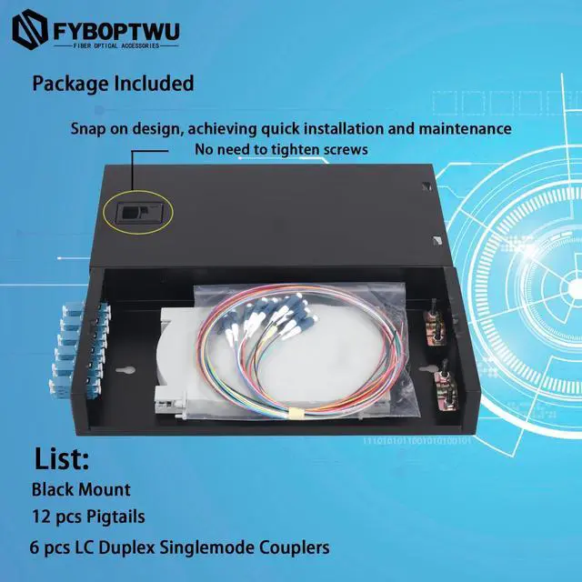 Large Space Fusion Disc Each tail fiber has its own winding channel, effectively protecting the fiber. ^^ Snap on DesignAchieving quick installation and maintenanceNo need to tighten screws. ^^ Thickness of Plate 1.0 mm; thickened and reinforced cold rolled sheet, sturdy and stableCorrosion resistant coating, long service life. ^^ Package IncludedBlack Mount, 12 pcs Pigtails, 6 pcs LC Duplex Singlemode Couplers ^^ Brand Service12 months after-sales service gives you a good shopping experience. If you have any problem, please contact us, we will solve it for you and make you reap satisfaction.