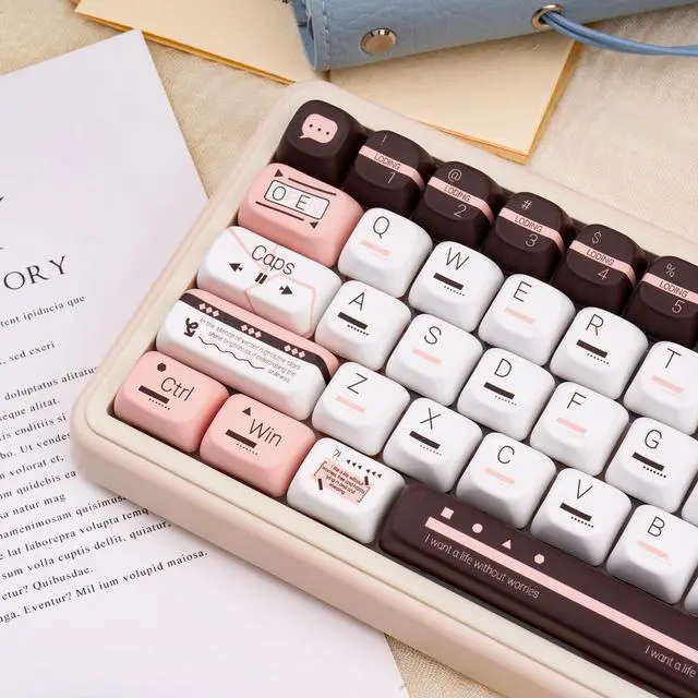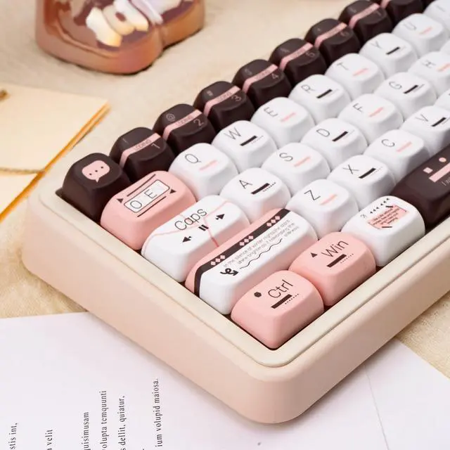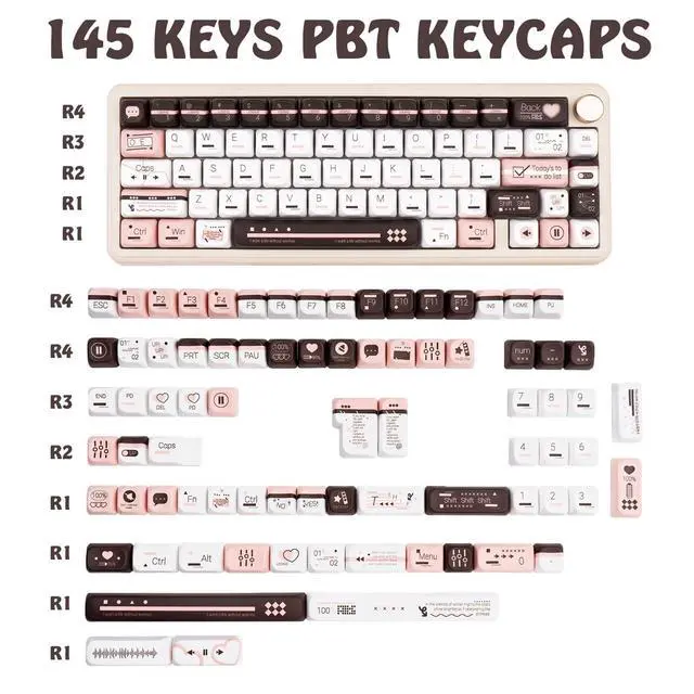 Not easy to fade: The heat sublimation process sublimates the ink at high temperature and penetrates into the PBT keycaps to form a solid color layer, which is not easy to fade even after long time use, keeping the COOMICKEY keycap pattern clear and colorful, and everlasting and new ^^ FOA Profile KeycapsPbt keycaps designed with FOA profile significantly enhance the user's typing experience. Since the height of these cute keycaps has been carefully adjusted, it allows fingers to fall more naturally on the surface of the pink keycaps, improving typing accuracy and speed. In addition, the rounded shape design helps guide fingers to quickly position themselves on the correct keys, reducing the possibility of mis-pressing ^^ Upgrade Your KeyboardThe set includes 145 high-quality keycaps and a key puller, offering multiple spacebar options in 2.25 u, 2.75 u, 6.25 u, and 7u sizes to accommodate various keyboard layouts. Designed for compatibility with most ANSI/ISO layout mechanical keyboards, this set works seamlessly with popular configurations like 60%, 65%, 75%, 80%, 96%, and 100% keyboards (61/64/68/75/84/87/96/104/108). Achieve a perfect fit and personalized look for your favorite keyboard setup ^^ Custom Keycaps TipsIncluding full-size keycaps and a keycap puller, not include keyboard.