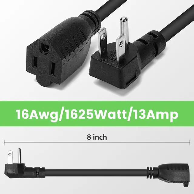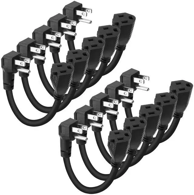 8 Inch Short Power Extension Cord 10Pack,90-Degree Low Profile Flat Plug 3-Prong Male to Female Heavy Duty Grounded Power Extension Cable Outlet Saver Socket Adapter, ETL Listed, 16AWG, SJTW 13A 1625W