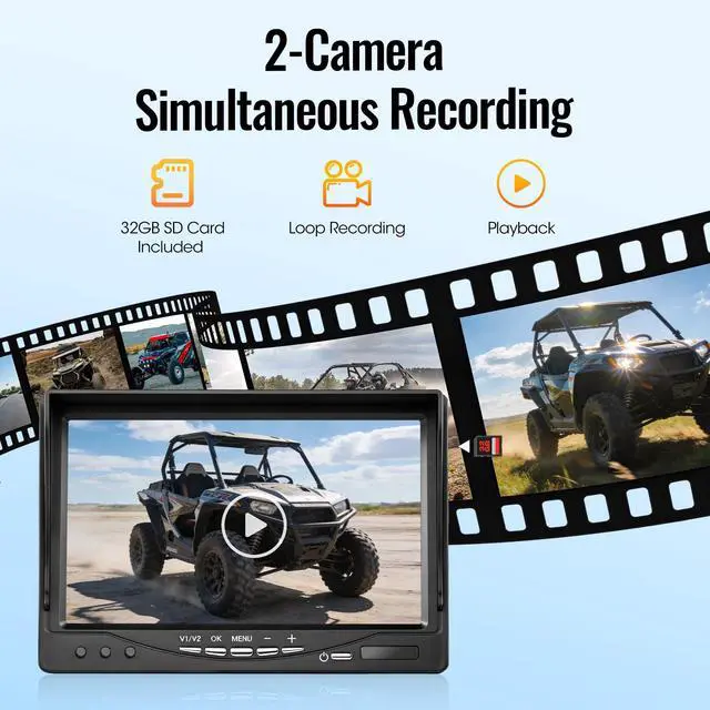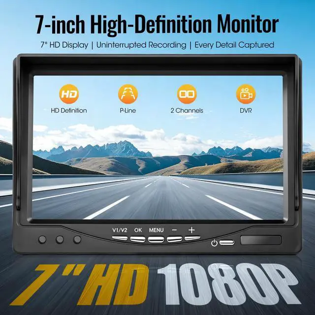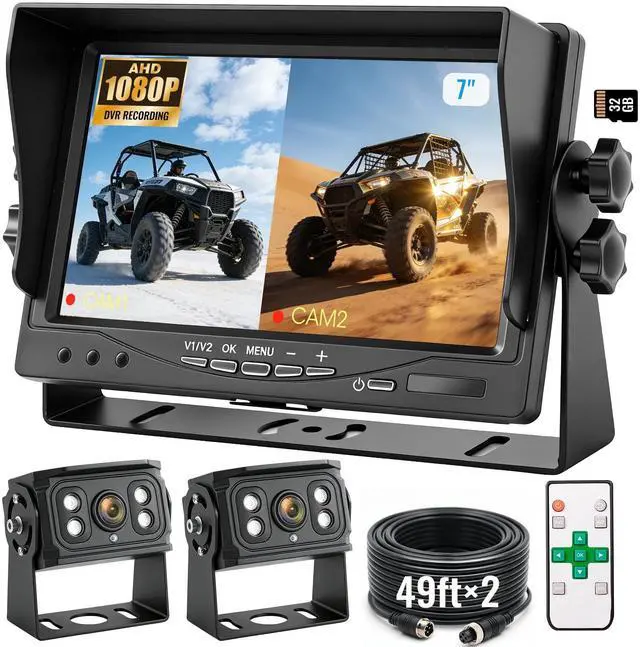 2026 Upgraded AHD1080P Backup Camera SystemBuilt tough for any job site or road, this camera is housed in durable all-metal to handle intense vibration and perform reliably in both freezing cold and blazing heat (-4F to 158F). Its the versatile choice for a wide range of vehicles: from commercial fleets like buses and RVs, to construction workhorses like excavators and forklifts, and agricultural equipment including tractors and combines. ^^ 7" HD Monitor with RemoteYour reliable partner on the road. This monitor guards your view against vehicle power surges and delivers smooth, real-time 1080P video. Easily switch between two camera views and mount it your way with the included bracket and suction cups. Simple buttons let you flip or mirror the image in a tap. Built tough and ready to use worldwide, it also comes with a handy mini remotejust pull the tab to start. ^^ Dual Waterproof and IR Night Vision CamerasEngineered for tough conditions, each camera provides IP69K waterproof protection and 20G impact resistance. The included extension cable comes with a reverse trigger wire and aviation-grade waterproof connector for broad vehicle compatibility. A 149 wide-angle lens delivers crisp 1080P true-color video, while enhanced IR LEDs maintain clear visibility in low light, making these cameras ideal for monitoring in darkness or heavy rain. ^^ Easy InstallationTwo installation methods are available for your convenience: 1) For continuous monitoring, simply connect the Yellow wire to DC 12-24V positive power, the Red wire to ACC, and the Black wire to groundthe trigger wire remains disconnected. 2) For reverse activation, once the above connections are made, attach the trigger wire to your vehicle's reverse light circuit. This allows the camera to automatically turn on and display the rear view when you shift into reverse gear. ^^ Intelligent Loop Recording & Playback SystemDesigned to enhance backing safety, this 1080P full HD monitor delivers clear visual guidance while its smart loop-recording feature continuously saves drive footage as dependable evidence. All recorded videos can be reviewed immediately right on the built-in screen. (A 32GB SD card is included for immediate use; the system also accommodates memory cards up to 128GB. ) ^^ Advanced Parking & Display FeaturesBy activating the parking guidance lines on the display, users can park more accurately with minimal input. The inclusion of one-touch image orientation adjustment (mirror/flip modes) further allows the system to be tailored to diverse camera placements and vehicle specifications. ^^ Worry-free ServiceWe back your purchase with an 18-month warranty and replacement guarantee.