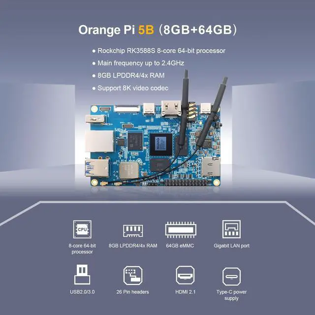 Performance]: Orange Pi 5B development board uses Rockchip RK3588S 8-core (4-core A76 and 4-core A55) 64-bit processor. Main frequency up to 2.4GH z, integrated ARM Mali-G610 GPU, embedded high-performance 3D/2D image acceleration module, built-in NPU with 6 Tops computing power, with 4GB/8GB/16GB/32GB (LPDDR4/4x) and 32GB/64GB/128GB/ eMMC, with dual-band Wi-Fi6, BT 5.0, and up to 8K display processing capability. ^^ [What's