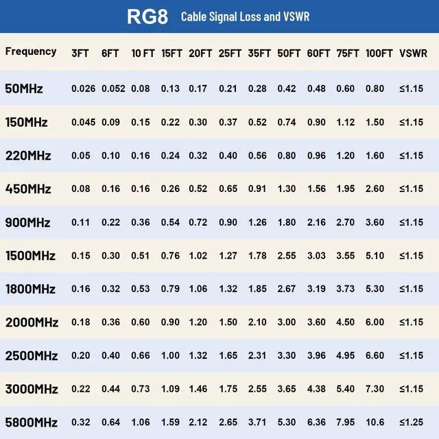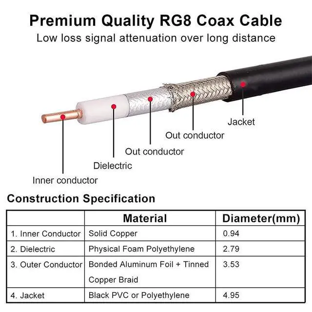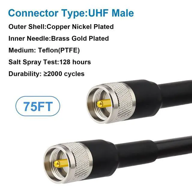 [LOW LOSS] -The loss of 75ft RG8 pl259 coaxial cable at 450MHZ signal frequency is less than 2.15 dB and the SWR 1.25. There is no need to worry about signal loss for long-distance high-frequency use. ^^ [Well Built Structure] - The inner conductor of this pl259 cable is made of copper clad aluminium, and the outer conductor is made of Aluminum foil and tinned copper braid which could maximum protect the signal over large distance. It could be better in resist oxidation. ^^ [Durable]- The jacket of this cb cable is made of PVC, which is waterproof and durable.