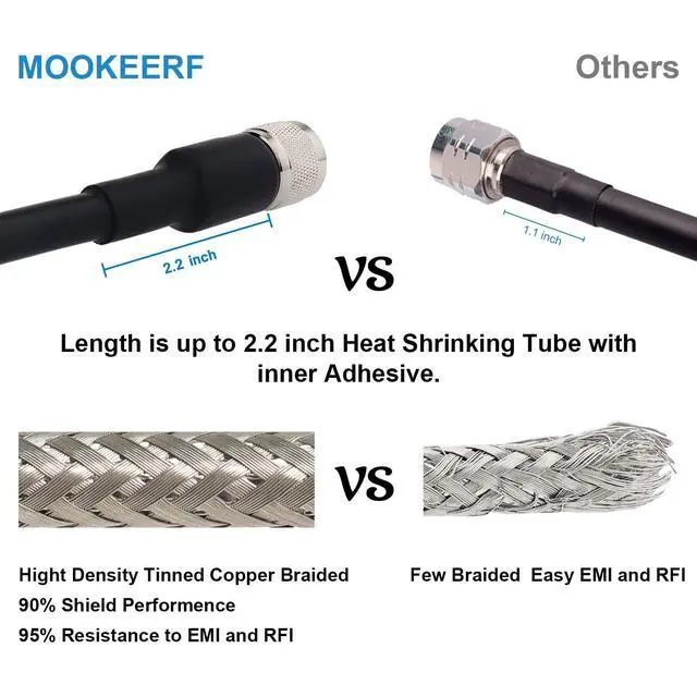 The shell of the uhf connector is made of high-quality copper nickel plated, which could be better in resist oxidation and corrosion. It can work even in outdoor harsh environments. ^^ [Prevent Coming Off]- Connection between UHF male connector and RG8 coaxial cable end is equipped with a 2.2" heat shrink tube and built with adhesive. It is very heavy duty and connectors are well integrated into cable. They prevent the connector from being easily pulled out when in use. ^^ [Applications] - This RG8 pl259 male to male coax cable could be used for CB ham radio, HF amateur radio, marine boat VHF radio, antenna, swr meter, surge protector, Walkie Talkies.
