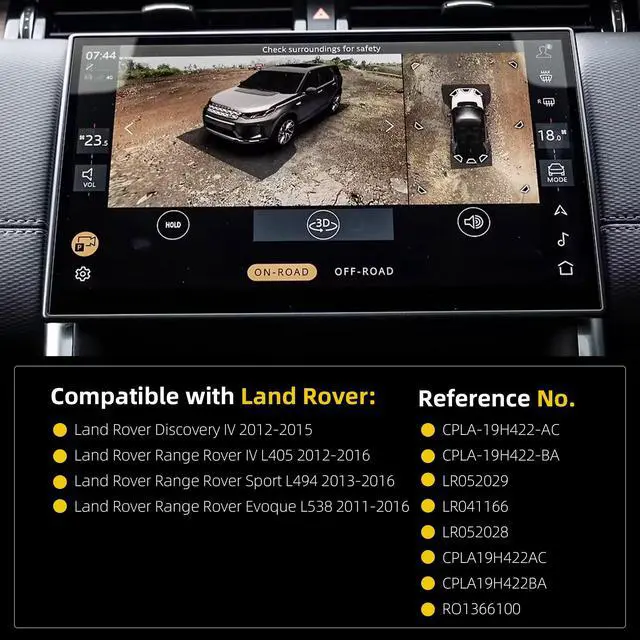 Direct OEM FitmentLand Rover Discovery IV 2012-2015 Land Rover Range Rover IV L405 2012-2016 Land Rover Range Rover Sport L494 2013-2016 Land Rover Range Rover Evoque L538 2011-2016 ^^ Replace Part NumberCPLA-19H422-AC, CPLA-19H422-BA, LR052029, LR041166, LR052028, CPLA19H422AC, CPLA19H422BA, RO1366100 ^^ Eliminate Blind Spots360 Ultra-Wide-Angle Lens for Enhanced Reversing Safety ^^ Eliminates blind spots with full rear coverage, helping prevent collisions with pedestrians/obstacles while backing up. Ensures secure parking and maneuvering with clear visibility ^^ Plug-and-Play InstallationThis original backup camera features seamless integration, serving as a direct replacement for factory components while maintaining compatibility with original factory coding.