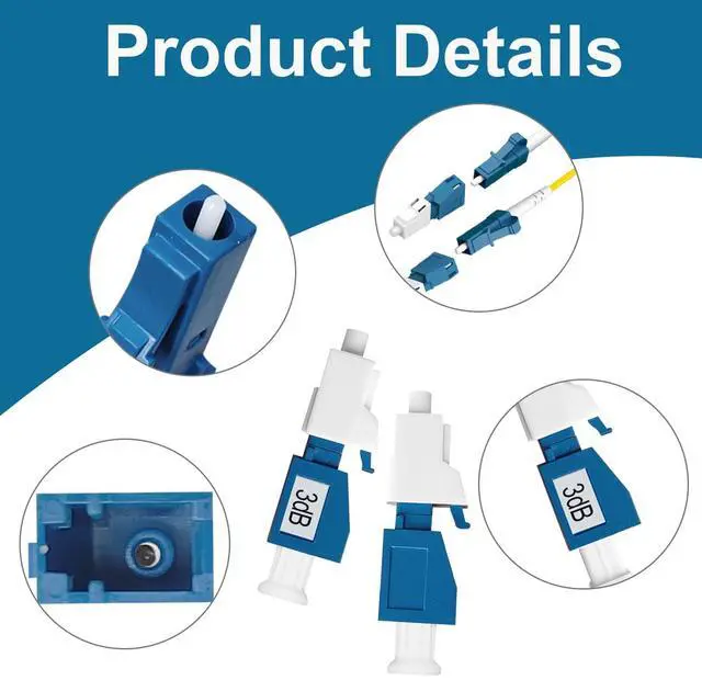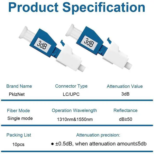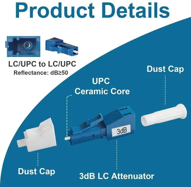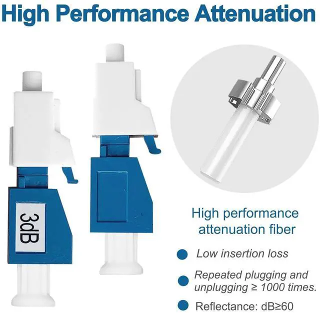 Connector TypeWith 3dB attenuation amount, LC-UPC female to LC-UPC male attenuator, made of high-performance attenuated fiber. ^^ Product FeaturesThe feature of the product is that the optical attenuator is widely applied in fiber optic communication system, having characteristics like high precision, strong impact resistance and stable and reliable performance. ^^ Good PerformanceLC UPC Fiber Optic Attenuator: With high-precision attenuation of 0.5 %dB, polarization related loss 0.2 dB, and return loss 50dB, it maximizes signal integrity and transmission stability. ^^ Plug and PlayThe fiber optic attenuator is easy to install, and its component structure is simple, facilitating easy assembly and safe storage, and the flexible and convenient plug and play enables you to complete the task more efficiently. ^^ Product ApplicationWidely used in fiber optic communication, fiber optic testing equipment, fiber optic cable television, etc. Usually used for debugging fiber optic instruments, attenuation of fiber optic signals etc.