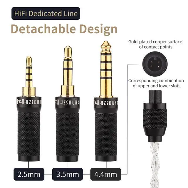 Detachable Plug Design: HZSOUND Heart Mirror Pro wired earbuds Optional for 2.5MM/3.5MM/4.4MM plugs, adapt to different playback interfaces. Gold-plated copper surface of contact points reduce the sound loss in transmission. Metal parts are aviation aluminum alloy material, and the surface adopts anti-oxidation process.