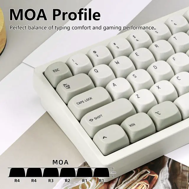 MOA Profile: The MOA profile keycaps are optimized from flat profiles like XDA, maintaining a uniform height across all keys. They feature a wider surface and softer edges for a smoother feel and a cuter, more playful aesthetic ^^
