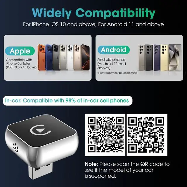 Wide CompatibilityThis wireless adapter designed for seamless integration and works with most factory-wired CarPlay systems. It supports iPhones from iOS 10+ and Android devices from version 11+. The package includes a USB-C adapter to ensure compatibility with both classic USB and modern USB-C car ports.