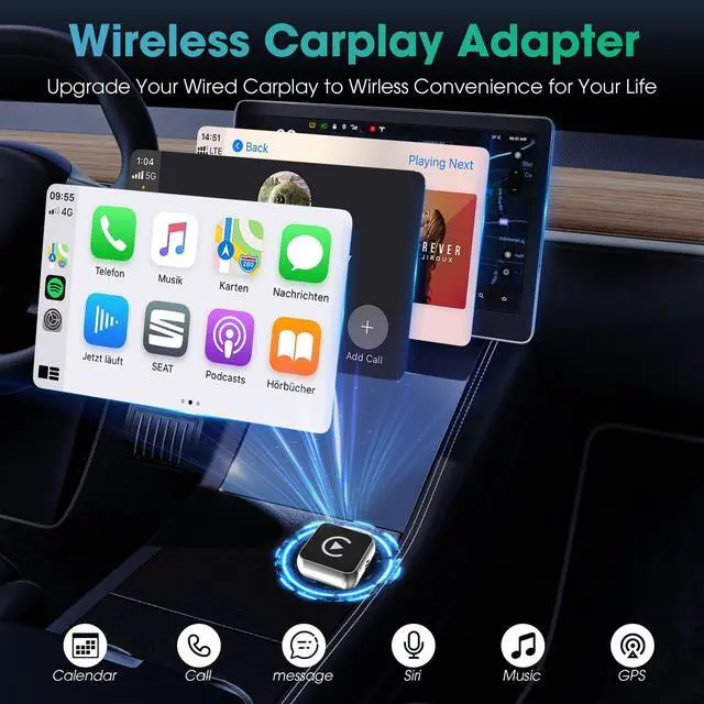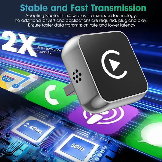 (remind: Please check your car supports wired CarPlay before purchase) ^^ Plug and Play It is easy to plug in the adapter and pair your device in your car. No app installation or downloads are required. Each time the vehicle is started, the adapter automatically reconnects instantly, ensuring a hassle-free initial setup and a durable, seamless connection. Please check if the wireless adapter is plugged in stable when you used it. ^^ Smart Cooling SystemEngineered with an advanced thermal management system, this wireless adapter maintains optimal temperature to prevent overheating. Enjoy consistently stable performance and uninterrupted connectivity, even during extended drives under demanding conditions. ^^ 2-in-1 Wireless CarPlay AdapterUpgrade from wired to wireless carplay adapter in seconds seamlessly convert your factory CarPlay or Android Auto system without cables. Featuring a revolutionary ultra-slim design that's 50% smaller than conventional adapters. It will convenient to take when will you need.