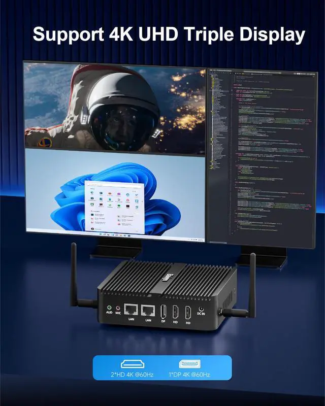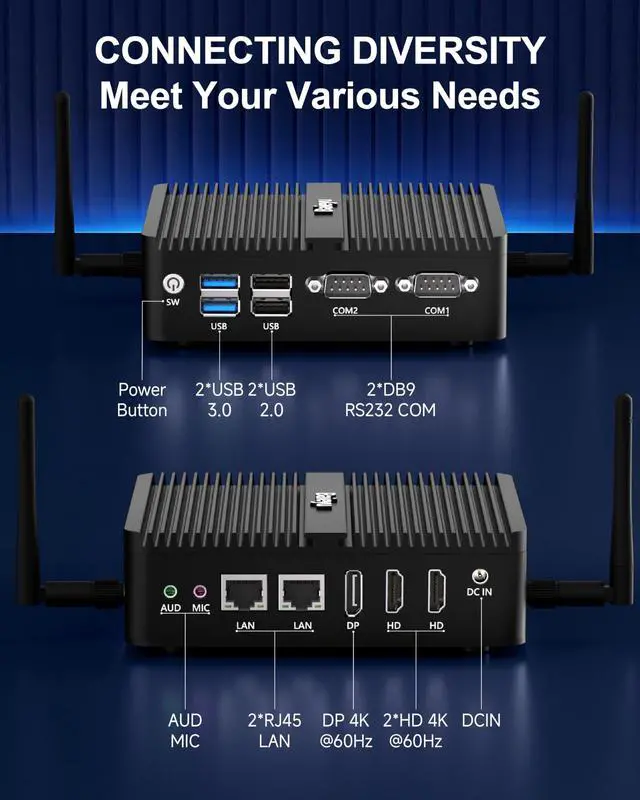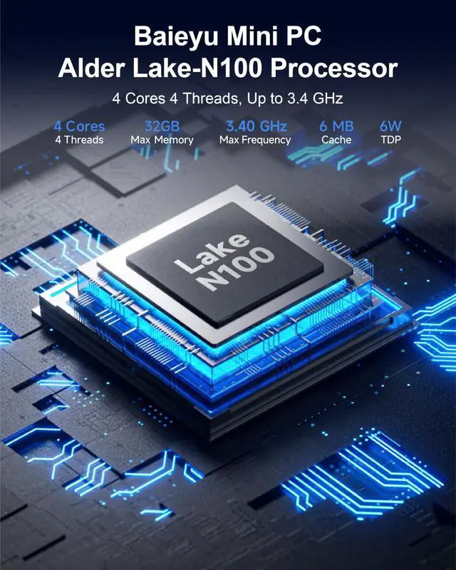 Powerful & Efficient Alder Lake-N100 ProcessorThe Baieyu minipc features an Alder Lake-N100 CPU (4C/4T, up to 3.4GH z Turbo, 6MB cache, 6W TDP), delivering smooth performance for office tasks and multimedia. Features UHD Graphics with dual HD 2.0 (4K@60Hz) and DP 1.2 (4K@60Hz) for multi-display setups. Supports AES-NI encryption for enhanced security. ^^ Versatile Connectivity & Expandable StorageBaieyu mini pc offers comprehensive I/O with front-facing 2 USB 3.0, 2 USB 2.0, and 2 RS232 COM ports for legacy devices. Rear ports include dual Gigabit Ethernet (Realtek RTL8168), audio jacks, and 12V DC power.