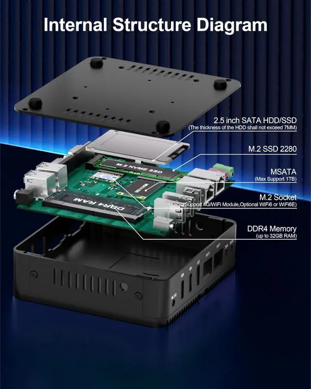 Expand storage via M. 2 NVMe SSD (MAX 2TB), mSATA SSD (MAX 1TB), and 2.5" SATA SSD/HDD (7mm) for flexible capacity upgrades. ^^ Advanced Features & OS CompatibilityThis mini PC supports with Windows 11 (also compatible with Windows 10 and Linux Ubuntu/Debian). It features dual-band WiFi 5 (AC3165) with BT 4.2, with an upgrade option for WiFi 6 (AX200) and BT 5.2 for faster wireless speeds. It is enhanced with TPM 2.0 security, Wake-on-LAN remote access, PXEUEFI only, and a Watchdog Timer for system reliabilityperfect for office, industrial, and smart home applications.