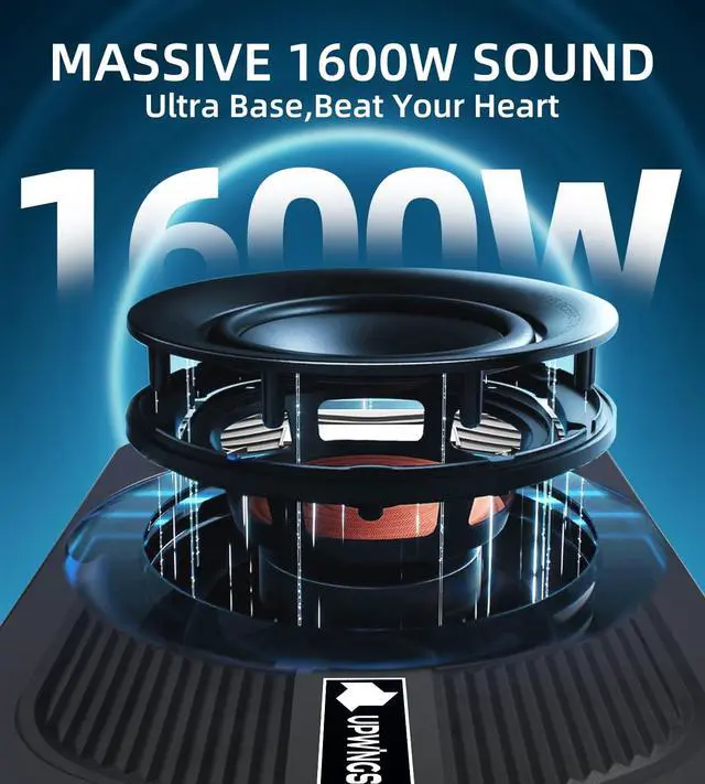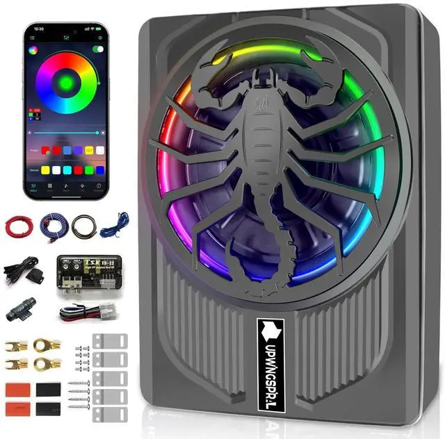 1600W Max Deep Bass PerformanceFeel the pulse of every beat with an upgraded 1600-watt peak power subwoofer and built-in amplifier. The racetrack-style design delivers stronger sound pressure and deeper, more defined bass. Perfect for car audio enthusiasts seeking impactful bass in compact spaces. ^^ Dynamic RGB Beat-Synced LightingElevate your driving experience with multi-color RGB lights that move in sync with your music. Control the lighting through the mobile appchoose your favorite color, adjust brightness, or turn it off anytime. Transform your daily commute into a vibrant, personalized music journey. ^^ Slim Aluminum Body, Powerful CoolingCrafted from cast aluminum, the under seat subwoofer features superior heat dissipation and a slim 2.76 -inch profile.