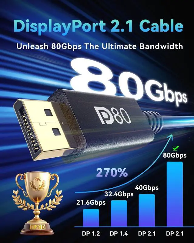 Universal & Intelligent Connectivity: This displayport cable 2.1 delivers 80Gbps bandwidth plus power delivery while intelligently working with all your DisplayPort gearfrom DP 1.2 (1440p) to DP 2.0 systems. It auto-optimizes performance for your specific setup, whether you're using RTX 40/50 or AMD 7900 GPUs with next-gen UltraGear/Odyssey monitors featuring G-Sync/FreeSync. One cable grows with your tech, eliminating dongle clutter while streamlining professional, gaming, and creative workflows ^^ Unleash Unmatched