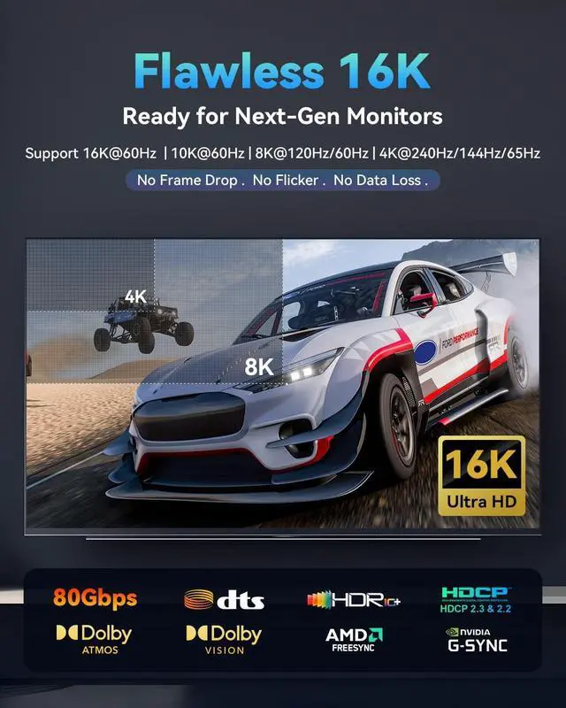 Next-Gen Monitors: Stay ahead of the curve. This displayport 2.1 cable is engineered to fully support upcoming monitor technologies, protecting your investment and ensuring compatibility with future hardware releases ^^ Pure, Uncompressed
