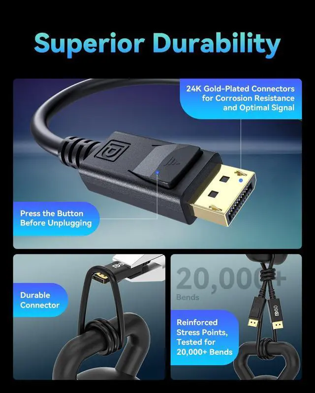 Last: Features a reinforced DisplayPort latch with quick-release button for secure, vibration-proof connections, plus military-grade braided jacket, 24K gold-plated connectors, and stress-relief tested for 20, 000+ bendsengineered for mission-critical professional and gaming setups ^^ Vibrant, True-to-Life