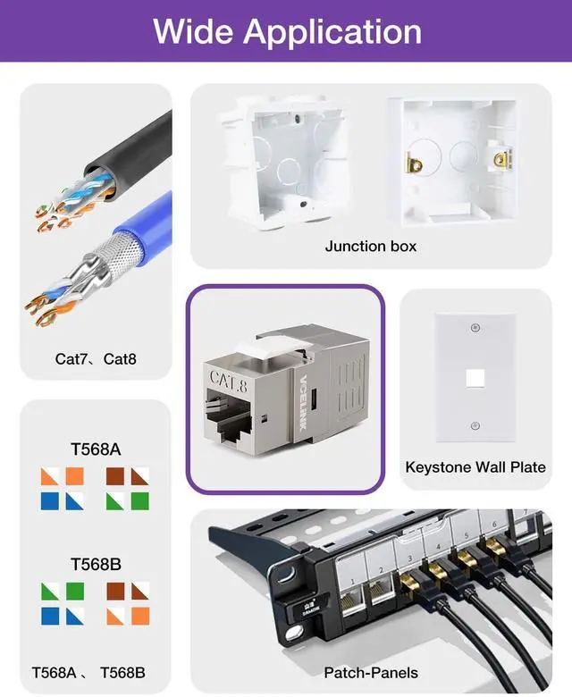 ^^ GOOD COMPATIBILITY: Full Metal Jacket RJ45 Shielded Keystone Jacks fit a standard wall plate or patch panel with a keystone blank port, supports 22 to 24 AWG solid or stranded wire, compatible with cat8/cat7/cat6a ethernet SFTP/FTP/UTP cables. SUPPORT PoE.