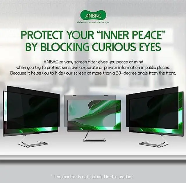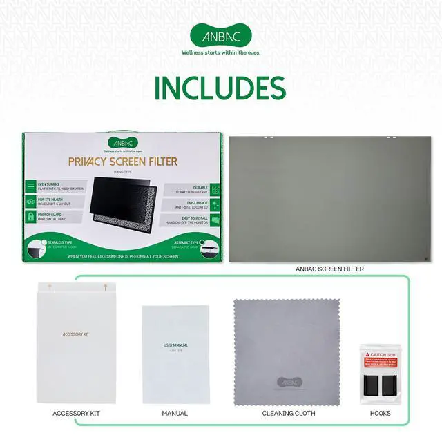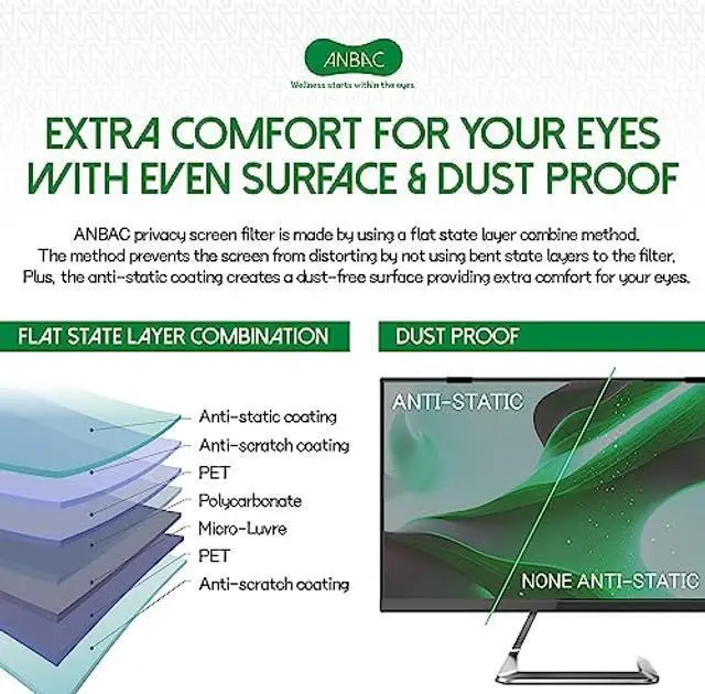 SMUDGE PROOF & DURABLE PRIVACY GUARD ANBAC hang type privacy screen filter protects your screen from others view. The advanced micro-louvre technology of the filter enables you to see a clear screen at the front and limits your screens viewing angle beyond 30 degrees to the left and right from your center view. Plus, additional coatings prevent statics and scratches on the screen thereby helping to secure a clear view by keeping the filter free of dust sticking & dents. ^^ FOR EYE HEALTH Protect your eyes from blue light, and other harmful rays! The privacy screen filter reduces blue light exposure from the screen and blocks harmful rays from sunlight reflection.