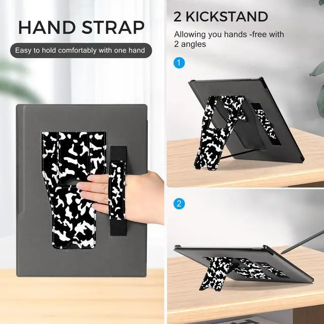 • Multi-Angle StandFoldable stand design with 2 ergonomic angles for comfortable viewing and typing. Elastic hand strap offers a secure, one-handed gripideal for reading, commuting, or on-the-go use.