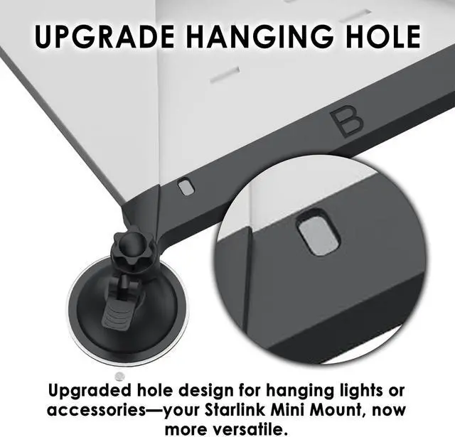 Perfect for outdoor adventures, road trips, and all-weather conditions. ^^ Versatile Mount with Convenient Hanging HoleFeaturing a built-in hanging hole, this mount allows you to attach accessories like camping lights or small gear, enhancing your outdoor experience while securely holding your device. ^^ Easy Installation Ideal Starlink Mini Mount for Cars and MoreQuickly install or remove this suction cup mount without tools on car windows, sunroofs, or other flat surfaces. Compact and portable, its the perfect car mount solution for seamless connectivity on the go.