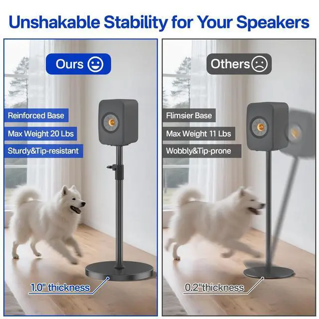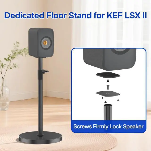Custom Design - Featuring a screw-fixed design, this floor speaker stands is precisely engineered for KEF LSX II stand, keeping your speakers securely in place. Even during high-volume playback or extended use, the speakers remain stable without shifting, preventing accidental slips and ensuring reliable protection. ^^ Adjustable Height For KEF LSX II Wireless HiFi speaker stand offers an adjustable height range of 33.4" to 44.5" for true ear-level precision. Whether sitting or standing, you can easily adjust the speakers to the ideal position for accurate sound staging and a better listening experience.
