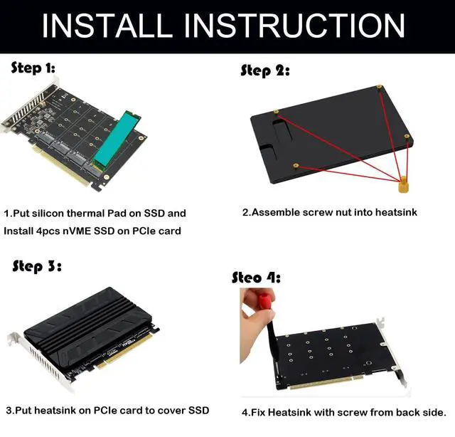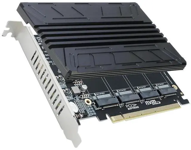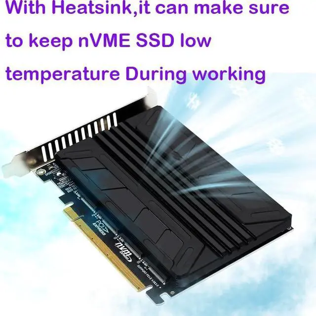 Motherboard: X299, X399 and Most Servers supporting PCIe x16 Bifurcation. ^^ Hardware requirement1. There is available PCI-e 4.0 or 3.0 x16 Slot on Mobo; 2. Motherboard support PCIe x16 Bifurcation itself which can be set as"PCI-e x4x4x4x4" in BIOS; 3. CPU has enough channels to support ^^ Heatsink & LED indicator DesignBig Aluminum heatsink cover ensure to keep low temperature of nVME SSD and will not cause a decrease in SSD transmission speed due to excessive temperature. The individual LED Indicator will show each SSD's Working Status.