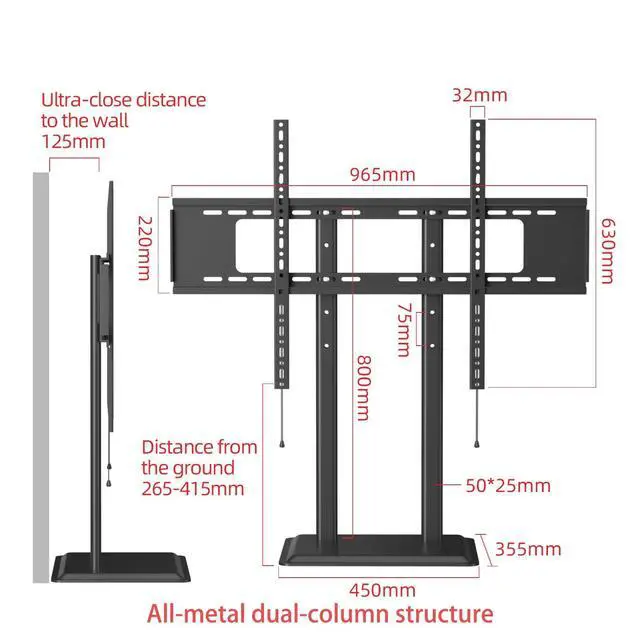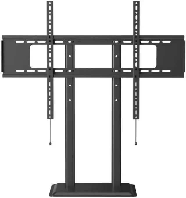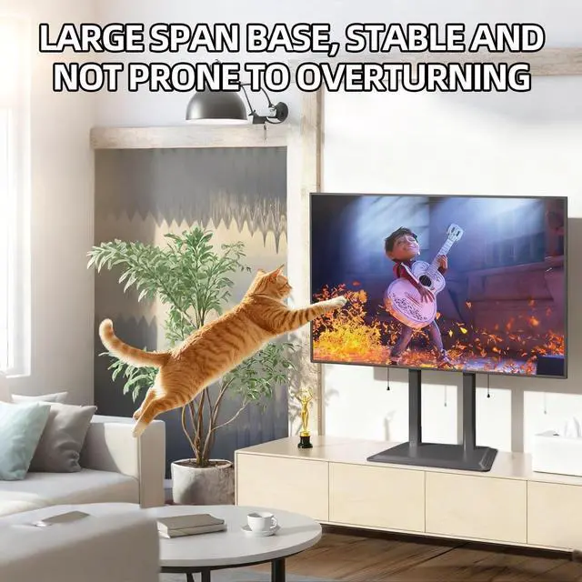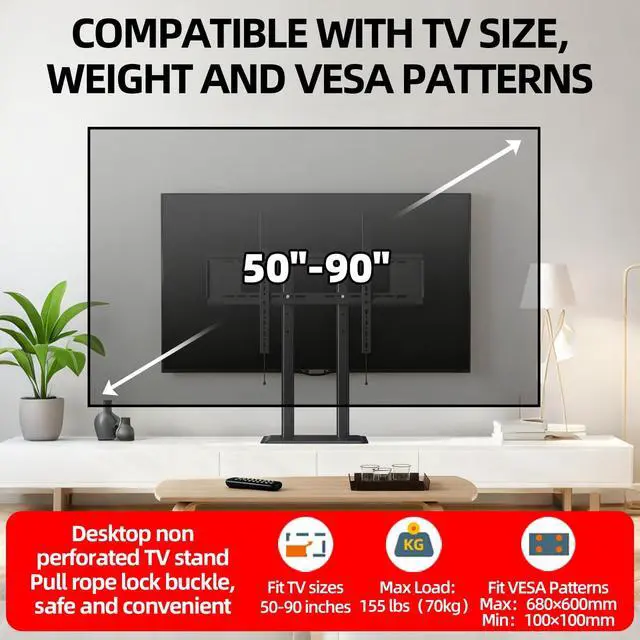 LARGER METAL BASE(45cm 35.5 cm)This all-metal TV stand offers enhanced stability and safety. Steel pillars and expert craftsmanship ensure this stand delivers robust and durable performance. ^^ UNIVERSAL DESIGNUniversal TV stand base fits most 50 to 100 inch flat-panel LCD/LED/Plasma TVs with VESA 600x600mm compatibility, Holds up to 155lbs, offering a versatile table top TV stand solution for large screens. It is an ideal choice for 75 77 85 and 86 inch TVs. ^^ HEIGHT ADJUSTMENT Table top TV stand has 3 level height adjustment to suit different applications or TV sizes. This 75 77 85 86 inch TV Stand mount features a good range of height adjustment for living room purposes.