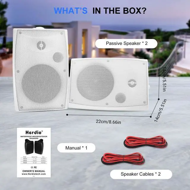 Perfect for DIY enthusiasts, the setup is quick and hassle-free ^^ PASSIVE SPEAKER DESIGN These are passive outdoor speakers wired, requiring an external amplifier or Bluetooth receiver to function. This design offers flexibility, allowing you to connect to your preferred audio system for customized sound output ^^ PRODUCT DIMENSIONS (L x W x H) &WHAT YOU GET 5.51" (14cm) (L) x 5.51" (14cm) (W) x 8.66" (22cm) (H). 2-Speakers, 2-Mount Brackets. 2-speaker cables( 16.4F eet/5meters)