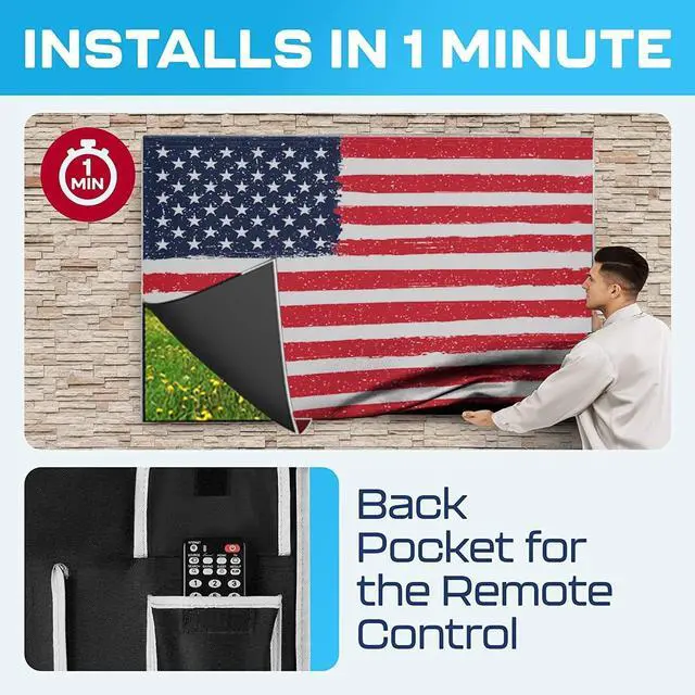 ^^ EASY TO INSTALL- You wont need any special skills to install this tv screen protector 65 inch around the mount on the wall or on the ceiling. The weatherproof tv cover outdoor slides easily to any television and mount. ^^ PROTECTION FOR LONGER TV LIFE - Your Outdoor TV Cover 65 Inch Waterproof can suffer in various ways from moisture, erosion, and dust, and an outdoor waterproof tv enclosure is the solution. It comes with storage pocket and space for the remote! Its the best tv protector.