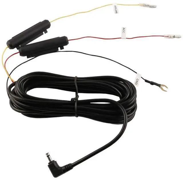 hardwire kit, which allows the cameras parking surveillance mode to function while the vehicles ignition is turned off. The built-in voltage meter in the main unit will be activated to monitor the battery level. It will automatically shut off the device if the voltage dips below the configurable voltage cut-off level.