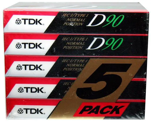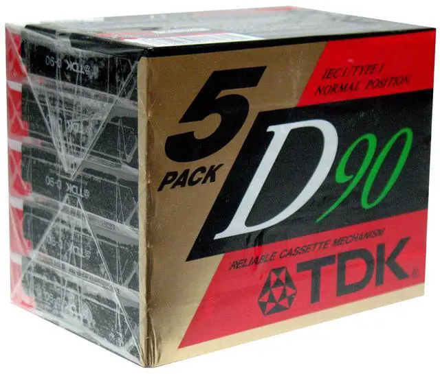 Pack of five (5) TDK High Output, Precision Rigid Construction Mechanism IEC I / Type I Normal Position D90 audio cassette tapes in original factory packaging and Slimline EcoCase for easier carrying and less plastic usage.