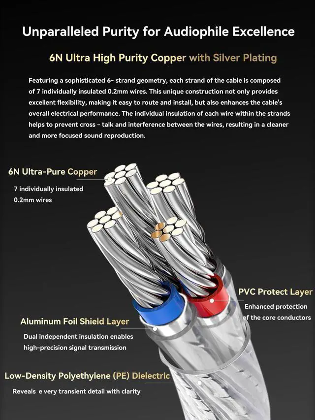 Audiophile-GradeConductor: 6N Ultra High Purity Silver-Plated Copper ( 99.9999 % purity)Construction: 6-strand geometry, each strand comprising 7 individually insulated 0.2 mm wiresInnovation: Per-strand independent shielding + Dual noise-canceling magnetic ringsInsulation