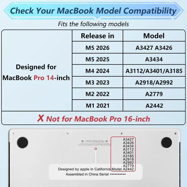 Compatibility With: Designed Only to be compatible with Macbook Pro 14 inch 2021 2022 2023 2024 2025 2026 M5 M4 M3 M2 M1 Pro or Max chip with Liquid Retina XDR display and Touch ID (