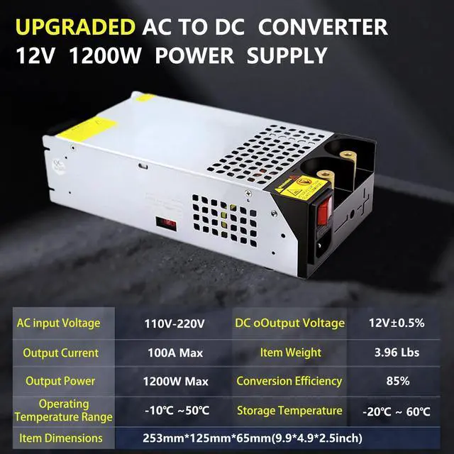 • NEW VERSION AC TO DC CONVERTERNew Upgrade 1200W converter build with Imported Aluminum alloy shell ,Built-in wire integrated design, Dual power connection methods, Very convenient for 12V devices with clamps, Our 100 amp power supply come with ul power cord ,12V power supply with switch ,wire lugs,metal clip and screw.Super convenient for devices with clamps. You can clamp to the two cylindrical contacts directly. It is a patent design of 12v dc power converter.