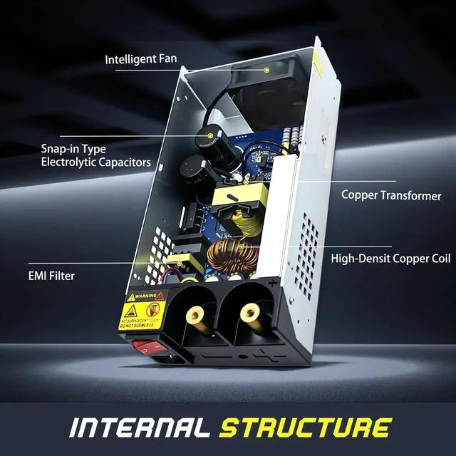 • SMART COOLING SYSTEM1200W Power Converters Aluminum Shell are designed with many heat dissipation holes, Built-in Cooling fan and dust-proof net, which effectively prevent dust from entering, ensure the stable rotation of the electric fan and prevent the circuit board from burning ; moreover, anti-skid pads are added to the bottom in this 110v to 12V converter, which can also make the bottom better heat dissipation and work more stable.
