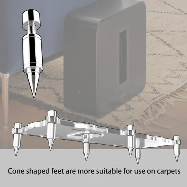 1Suitable for Sonos Sub 4 Woofer spike and cone point feet, help to keep the tones more focused and less noise. ^^ 2Used between spike and ground, and plays a important role in reducing booming. ^^ 3The Feet Pads Made of high-quality 304 stainless steel material and are CNC machined, The stand is made of acrylic. effectively isolate and suspend acoustic feedback from your Sub mini woofer. ^^ 4The Stand Feet Pads will increase air flow between components. Using them to stack your sonos sub 4 to get airflow to the bottom amp.