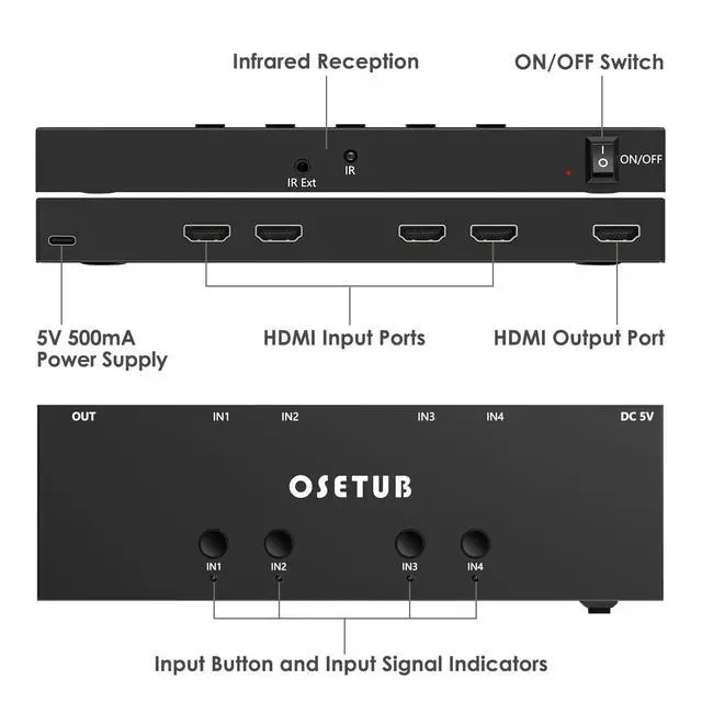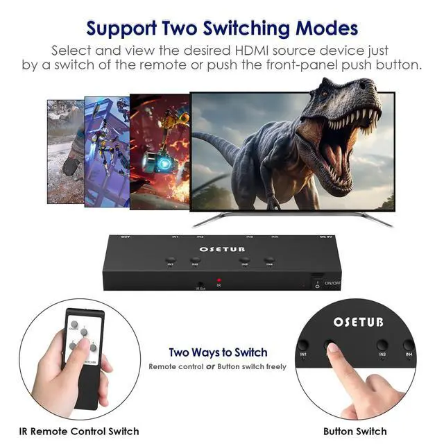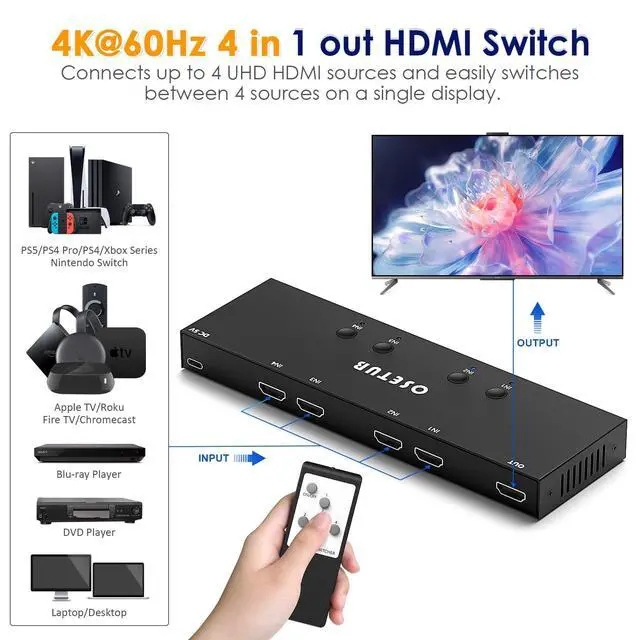 4K@60Hz 4 Ports HDMI Switches This 4 ports HDMI Switch supports up to 4K@60HZ resolution and backward compatible with lower resolution, can connect up to 4 UHD HDMI sources on a single display and easily switch between 4 sources. Seamlessly switch between games, movies, and TV shows. Save your work space and improve your work efficiency. ^^ 4K Ultra-HD ExperienceOseTub 4 in 1 out HDMI Switch support bandwidth 18Gps/600MHZ, HDCP 2.2, HDR 10 Dolby Vision, 4Kx2K@60HZ