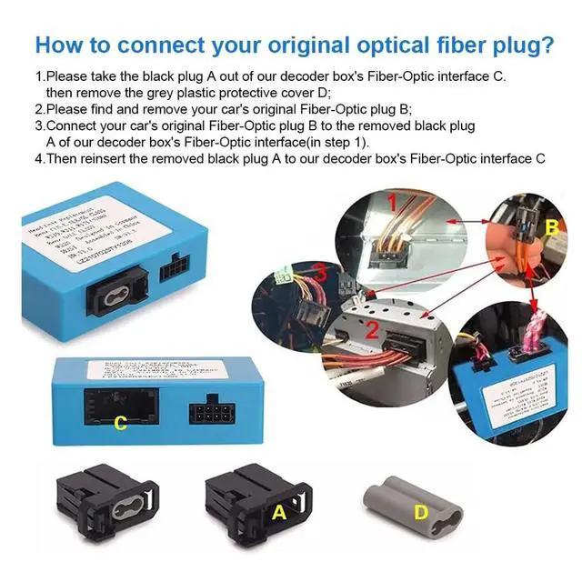Easy to install, plug & playNo need to run 6 meter long cables from front to rear (your car's trunk). All cables just need to be connected in front. ^^ Quick noteA few models might need an extra Fiber Optic Loop Adapter for everything to work smoothly if it can not work after install. Please check if your car has: Factory navigation system Satellite radio tuner (like SiriusXM) CD changer (CDC) ^^ Multiple Compatible Car ModelsPlease double-check your vehicle model for compatibility. ^^ Fiber Optic Decoder for Porsche Boxster2004 / 2005 / 2006 / 2007 / 2008 / 2009 / 2010 / 2011 / 2012 / 2013 / 2014 / 2015 Year ^^ Fiber Optic Decoder for Porsche 9112004 / 2005 / 2006 / 2007 / 2008 / 2009 / 2010 / 2011 / 2012 / 2013 / 2014 / 2015 Year ^^ Fiber Optic Decoder for Porsche Cayenne2004 / 2005 / 2006 / 2007 / 2008 / 2009 / 2010 / 2011 / 2012 / 2013 / 2014 / 2015 / 2016 Year